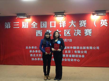2013第三届全国口译大赛 西北大区赛 于2013年12月7日在陕西省图书馆多媒体报告厅落下帷幕。经各省初赛、复赛层层选拔,来自西北五省的12名选手参加了此次比赛。我校威廉希尔足球官网2012级MTI翻译硕士研究生王萍同学凭借过硬的口译能力和从容的现场把控力,获得资深译员评委认可,并赢得现场观众的热烈掌声,荣获一等奖;孔俊芳同学获得三等奖;指导老师常虹副教授获优秀指导教师奖。王萍、孔俊芳同学将代表西北大区,顺利晋级2014年4月在青岛举行的全国口译大赛半决赛。